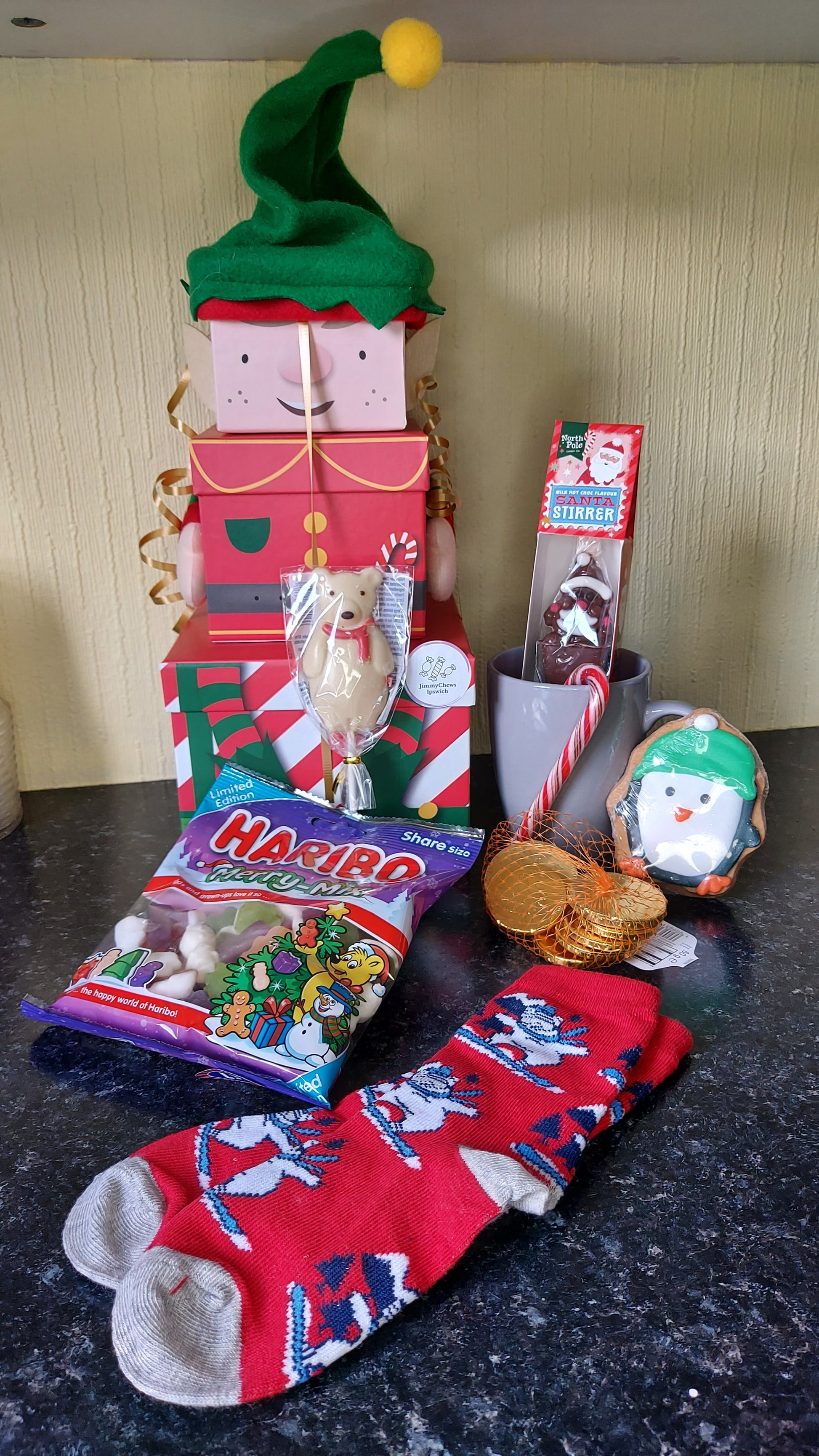 1 pair Christmas Socks, 1 bag Haribo Festive Jellies, 1 Hot Chocolate Stirrer, 1 Mug, 1 Candy Cane, 1 Christmas Cookie, 1 bag Chocolate Coins, 1 Chocolate Christmas Lolly, 500g Christmas Mix (Not shown)